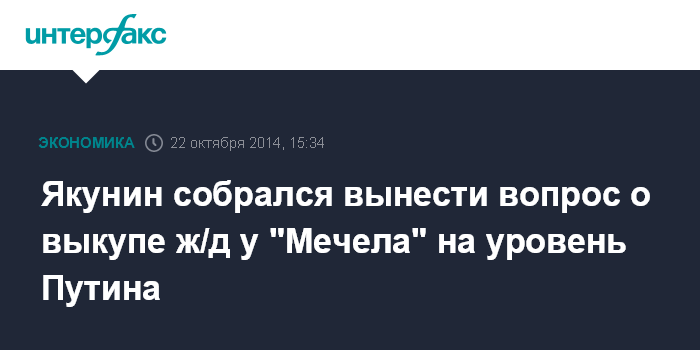 Москва. 22 октября. INTERFAX.RU - Руководитель РЖД Владимир Якунин рассчитывает вынести вопрос о выкупе железной дороги к Эльге у "Мечела" на уровень президента РФ Владимира Путина.