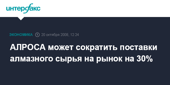 Москва. 20 октября. INTERFAX.RU – Алмазодобывающая АК "АЛРОСА" планирует сократить поставки алмазного сырья на рынок до 30%, сообщил "Интерфаксу" представитель компании. По его словам, сокращения коснутся всего ассортимента алмазной продукции.