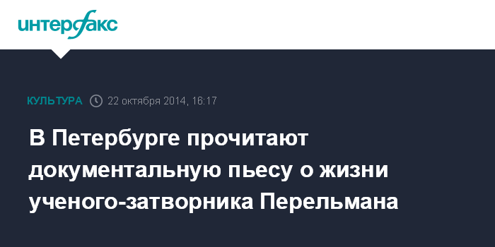 Москва. 22 октября. INTERFAX.RU - В Петербурге состоится читка пьесы о жизни российского математика Григория Перельмана, написанная польским драматургом Михалом Пабианом. Об этом сообщается на странице Новой сцены Александринского театра в социальных сетях.