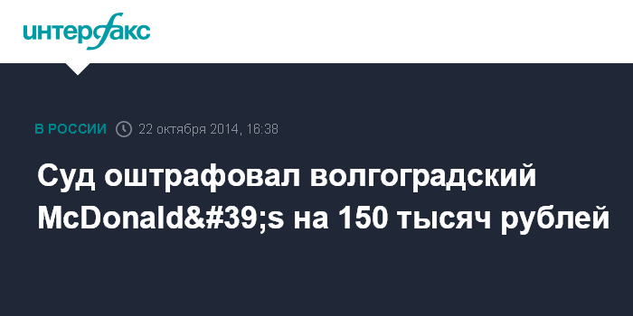 Москва. 22 октября. INTERFAX.RU - Арбитражный суд Волгоградской области назначил административный штраф в размере 150 тысяч рублей ресторану "Макдоналдс" в Волгограде, сообщили агентству "Интерфакс" в пресс-службе суда в среду.