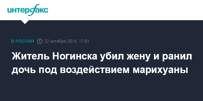 Москва. 22 октября. INTERFAX.RU - Анализ крови жителя подмосковного Ногинска, убившего жену и ранившего ножницами трехлетнюю дочь и тестя, показал, что он употреблял марихуану. Об этом сообщает пресс-служба ГСУ СК по Москвоской области.