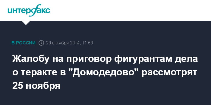 Москва. 23 октября. INTERFAX.RU - Верховный суд РФ отложил до 25 ноября рассмотрение апелляционной жалобы на приговор четверым фигурантам дела о подготовке теракта в столичном аэропорту "Домодедово", совершенного в январе 2011 года.