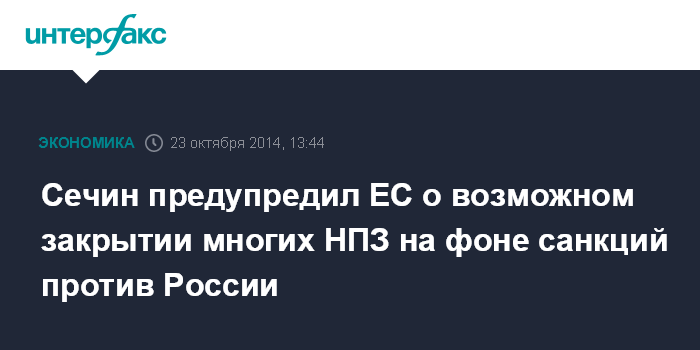 Москва. 23 октября. INTERFAX.RU - Санкции против российской нефтяной отрасли могут привести к закрытию многих НПЗ в Европе, заявил глава "Роснефти" Игорь Сечин, выступая на третьем Евразийском форуме "Инновации и международная интеграция" в итальянской Вероне.