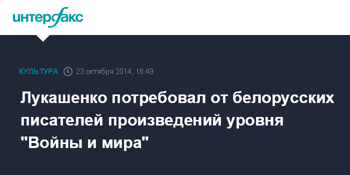 Москва. 23 октября. INTERFAX.RU - Белорусских писателей ничто не сдерживает в свободе творчества, однако великих произведений в стране не появляется, заявил президент Белоруссии Александр Лукашенко.