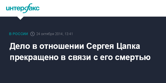 Москва. 24 октября. INTERFAX.RU - Российский Верховный суд прекратил уголовное дело в отношении Сергея Цапка, осужденного на пожизненное заключение за многочисленные убийства в станице Кущевская, в связи с его смертью .