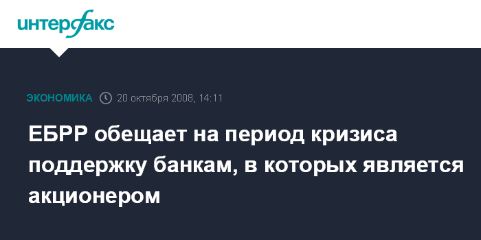 Москва. 20 октября. INTERFAX.RU - Европейский банк реконструкции и развития (ЕБРР) пообещал на период кризиса поддержку тем финансовым институтам, акционером которых он является. "Там, где у банка есть пакет акций, а это около 100 банков и небанковских финансовых институтов, он будет, в случае необходимости, использовать свои позиции в советах директоров и свой капитал для предоставления дополнительной поддержки", - говорится в письме главы ЕБРР Томаса Мирова совету директоров банка.