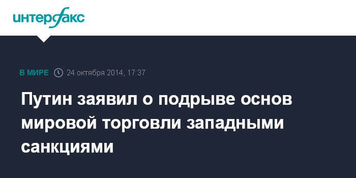 Москва. 24 октября. INTERFAX.RU - Президент РФ Владимир Путин заявил, что деловое сообщество в условиях введенных в отношении России санкций подвергается мощному нажиму западных правительств, что также нарушает принцип глобализации и подрывает основы мировой торговли.