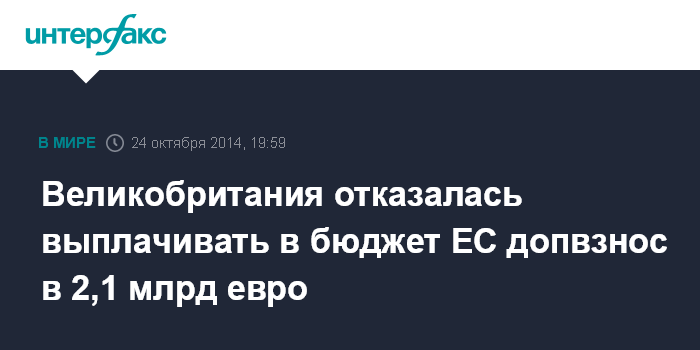 Москва. 24 октября. INTERFAX.RU - Великобритания не намерена вносить еще 2,1 млрд евро ($2,7 млрд или 1,7 млрд фунтов) в бюджет Европейского союза, заявил в пятницу премьер-министр страны Дэвид Кэмерон.