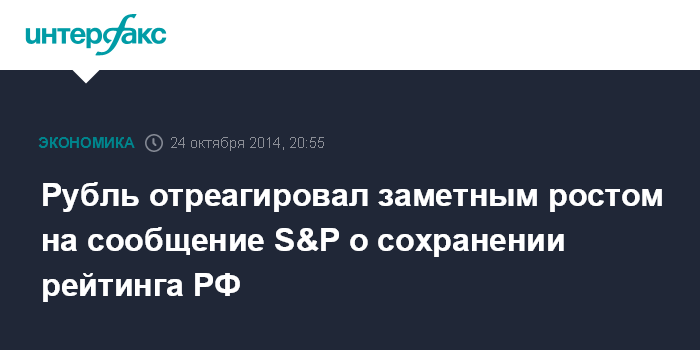Москва. 24 октября. INTERFAX.RU - Российский рубль отреагировал заметным ростом на вечерних торгах Московской биржи на сообщение о сохранении рейтинга России агентством Standard & Poor's (S&P) на уровне "BBB-".