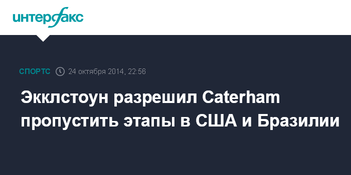 Москва. 24 октября. INTERFAX.RU - Генеральный просмоутер "Формулы-1" Берни Экклстоун дал Caterham разрешение на пропуск двух следующих этапов чемпионата мира, пока кризисные управляющие, получившие контроль над командой, ищут для нее покупателя. Согласно Договору согласия, все подписавшие его команды обязаны принять участие во всех гонках сезона.