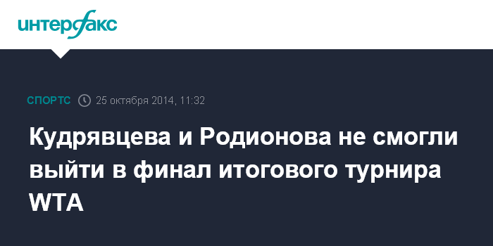 Москва. 25 октября. INTERFAX.RU - Российская теннисистка Алла Кудрявцева и представительница Австралии Анастасия Родионова в полуфинале парного разряда итогового чемпионата Женской теннисной ассоциации (WTA) в Сингапуре уступили тайваньско-китайскому дуэту Си Сувэй/Пэн Шуай - 1:6, 4:6.