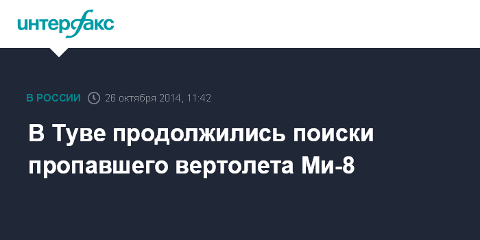 Москва. 26 октября. INTERFAX.RU - В Туве продолжаются поиски пропавшего вертолета Ми-8, в поисково-спасательных работах участвуют пять воздушных судов и 10 наземных групп, говорится в сообщении на сайте ГУ МЧС России по республике Тува.
