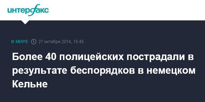 Москва. 27 октября. INTERFAX.RU - В Кельне 44 полицейских получили ранения в ходе столкновений с радикально настроенными противниками проживающих в Германии салафитов - сторонников крайне консервативного ислама, пишут в понедельник немецкие СМИ.