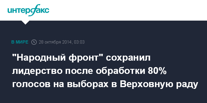 Москва. 28 октября. INTERFAX.RU - После обработки 80,17% протоколов, полученных Центризбиркомом от избирательных комиссий, на прошедших в воскресенье выборах в Верховную Раду, "Народный фронт" набирает 21,94% голосов, а "Блок Петра Порошенко" - 21,6% голосов избирателей.