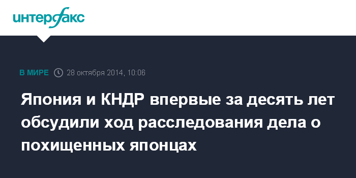 Москва. 28 октября. INTERFAX.RU - Официальные лица из Японии и КНДР впервые за десять лет приступили к переговорам о ходе расследования судеб японцев, похищенных в 1970-е и 1980-е годы сотрудниками северокорейских спецслужб, передает во вторник агентство AP.