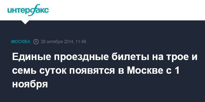 Москва. 28 октября. INTERFAX.RU - Московские власти с 1 ноября расширяют билетное меню городского пассажирского транспорта: вводятся единые безлимитные проездные билеты (смарт-карты) на трое и семь суток, сообщил мэр столицы Сергей Собянин.