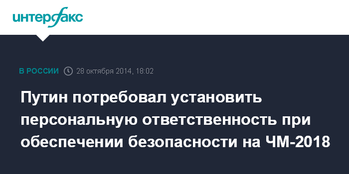 Москва. 28 октября. INTERFAX.RU - Президент России Владимир Путин потребовал четкого взаимодействия ведомств и обозначения персональной ответственности в обеспечении безопасности при проведении чемпионата мира по футболу в 2018 году в России.