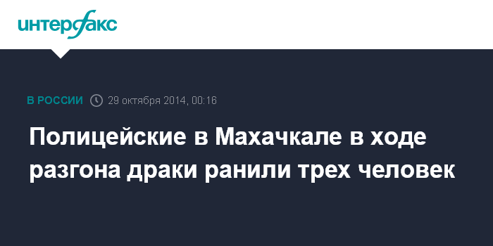 Москва. 29 октября. INTERFAX.RU - Наряд полиции вынужден был применить табельное оружие в центре Махачкалы при пресечении массовой драки, трое ее участников ранены, сообщили во вторник агентству "Интерфакс" в пресс-службе МВД по Республике Дагестан.