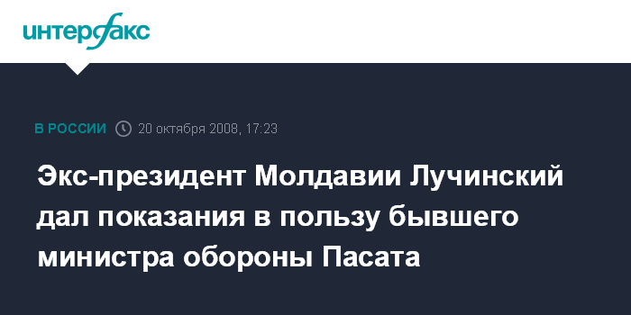 Кишинев. 20 октября. INTERFAX.RU - Бывший президент Молдавии Петр Лучинский в понедельник дал показания в суде по делу бывшего министра обороны Молдавии Валерия Пасата.