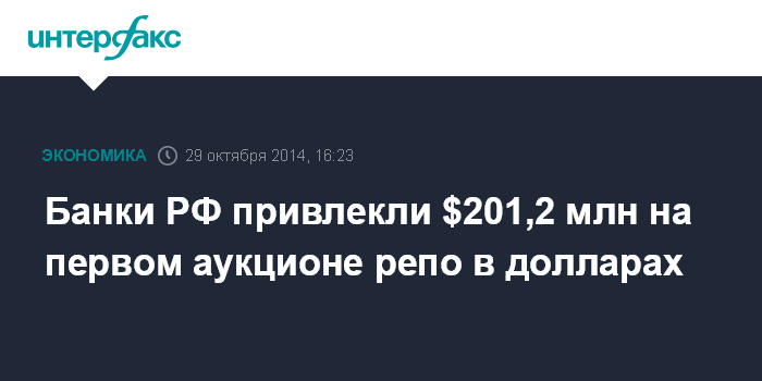 Первый аукцион репо в долларах на 28 дней прошел 29 октября, первый аукцион в долларах на 1 неделю Банк России планирует провести 30 октября 2014 года. Предполагаемый лимит на аукционе на срок 1 неделя составит до $2,0 млрд.
