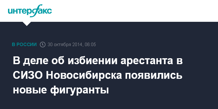 Москва. 30 октября. INTERFAX.RU - Следственные органы СКР по Новосибирской области установили исполнителей и организаторов жестокого избиения арестанта в СИЗО N1 Новосибирска, послужившего причиной отставки начальника следственного изолятора. Об этом сообщает СУ СКР по региону.