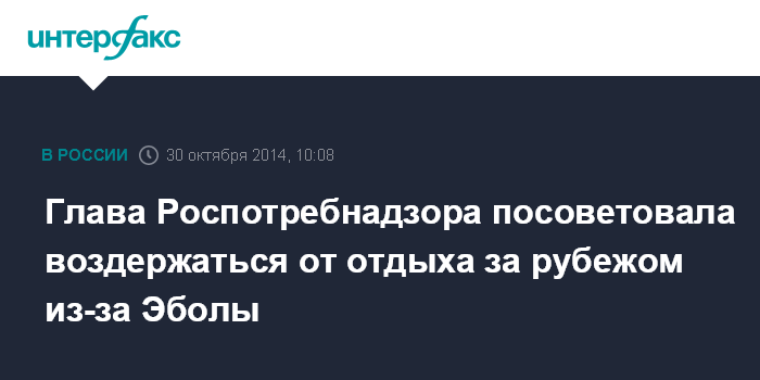 Москва. 30 октября. INTERFAX.RU - В связи со вспышкой лихорадки Эбола россиянам лучше воздержаться от поездок на отдых за границу, заявила "Интерфаксу" в четверг руководитель Роспотребнадзора, главный государственный санитарный врач РФ Анна Попова.