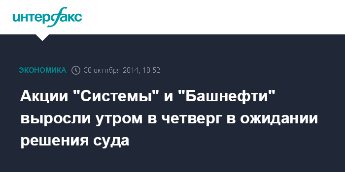 Москва. 30 октября. INTERFAX.RU - Акции АФК "Система" и "Башнефти" утром в четверг растут в цене в ожидании решения Арбитражного суда Московы, который рассматривает иск Генпрокуратуры и Росимущества к АФК и ее "дочке" "Система-Инвест" об истребовании акций "Башнефти" в пользу государства.