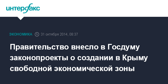 Москва. 31 октября. INTERFAX.RU - Премьер-министр РФ Дмитрий Медведев подписал распоряжение о внесении в Госдуму законопроектов о создании свободной экономической зоны в Крымском федеральном округе, сообщает в пятницу сайт правительства.