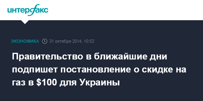 Москва. 31 октября. INTERFAX.RU - "Завтра может быть постановление правительства о стодолларовой скидке Украине", - сказал глава Газпрома Алексей Миллер в интервью "России 24", которое было записано в Брюсселе в ночь с четверга на пятницу.
