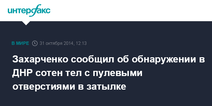 Москва. 31 октября. INTERFAX.RU - Власти самопровозглашенной Донецкой народной республики утверждают, что на территории ДНР было обнаружено почти 300 тел с пулевыми отверстиями в затылке.