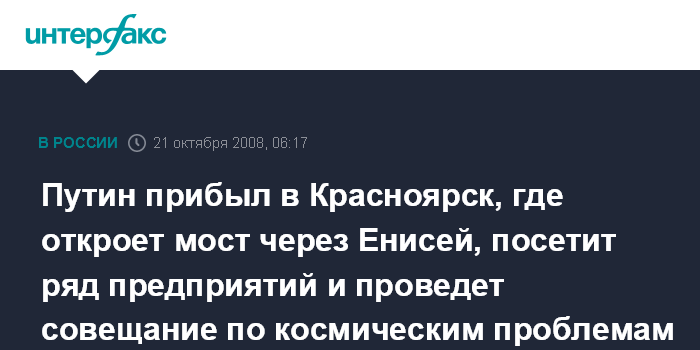 Красноярск. 21 октября. ИНТЕРФАКС - Премьер-министр РФ Владимир Путин в рамках рабочей поездки в Сибирский федеральный округ прибыл в Красноярск, где проведет совещание по вопросам реализации приоритетных задач российской космической деятельности.