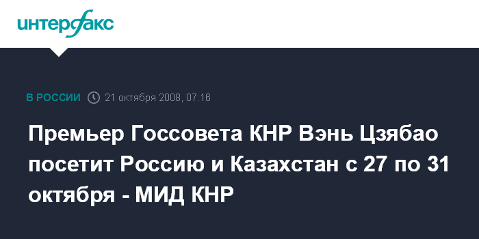 В сообщении, размещенном на официальном сайте китайского внешнеполитического ведомства, говорится, что "премьер Госсовета КНР Вэнь Цзябао посетит Россию и Казахстан с официальными визитами с 27 по 31 октября по приглашению премьер-министра РФ Владимира Путина и премьер-министра Казахстана Карима Масимова".