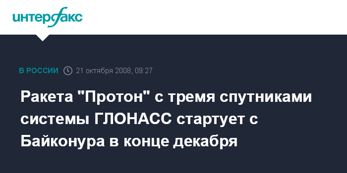 Москва. 21 октября. INTERFAX.RU - Запуск с Байконура ракеты космического назначения "Протон-М" с разгонным блоком "ДМ" и тремя спутниками "Глонасс-М", которые должны будут пополнить российскую глобальную навигационную систему ГЛОНАСС, назначен на 25 декабря.