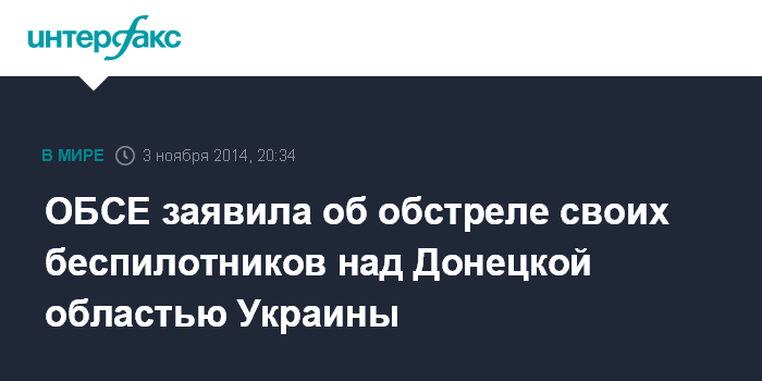 Москва. 3 ноября. INTERFAX.RU - В специальной мониторинговой миссии ОБСЕ утверждают, что их беспилотные летательные аппараты были подвергнуты атакам 29 октября и 2 ноября на востоке Украины.