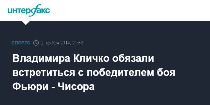 Москва. 3 ноября. INTERFAX.RU - Следующим соперником чемпиона мира в супертяжелом весе по версиям IBF, WBA, WBО, IBO украинца Владимира Кличко в рамках обязательной защиты титула WBO станет победитель поединка двух британских боксеров Дерека Чисоры и Тайсона Фьюри, сообщает klitschko-brothers.com.