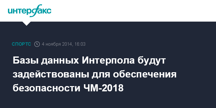 Москва. 4 ноября. INTERFAX.RU - МВД России будет использовать базы данных Интерпола при обеспечении безопасности Чемпионата мира по футболу в 2018 году, заявил министр внутренних дел РФ Владимир Колокольцев, выступая на министерской встрече в рамках 83-й сессии Генеральной ассамблеи Интерпола.