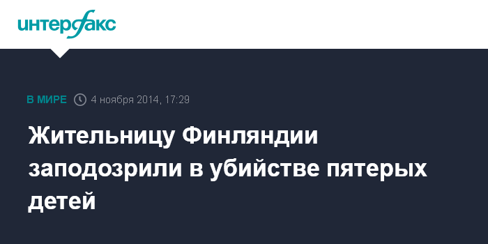 Москва. 4 ноября. INTERFAX.RU - В Финляндии 35-летняя жительница города Оулу (Oulu) подозревается в убийстве пятерых своих детей.