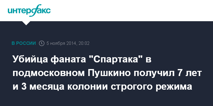 Москва. 5 ноября. INTERFAX.RU - Суд в Подмосковье приговорил уроженца Узбекистана, обвиняемого в убийстве фаната "Спартака" в Пушкино, к 7 годам и 3 месяцам лишения свободы.
