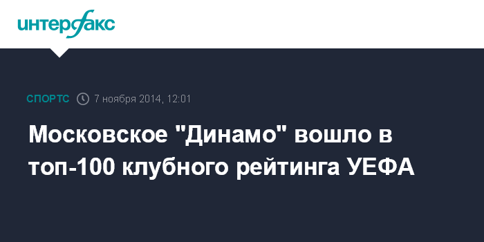 Москва. 7 ноября. INTERFAX.RU - Московский футбольный клуб "Динамо" поднялся со 104-го на 95-е место в командном рейтинге УЕФА.