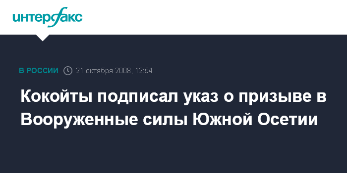 Москва. 21 октября. INTERFAX.RU - Президент Южной Осетии Эдуард Кокойты подписал указ о призыве на действительную срочную службу граждан в Вооруженные силы республики. Призыв начнется 25 октября и пройдет в течение октября-ноября 2008 года.