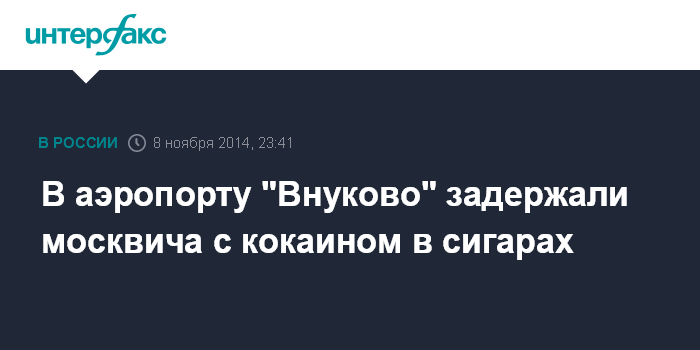Москва. 8 ноября. INTERFAX.RU - В субботу вечером сотрудники правоохранительных органов задержали в аэропорту "Внуково" жителя Москвы, пытавшегося ввезти из Доминиканы в Россию кокаин. Об этом "Интерфаксу" сообщил источник в правоохранительных органах.
