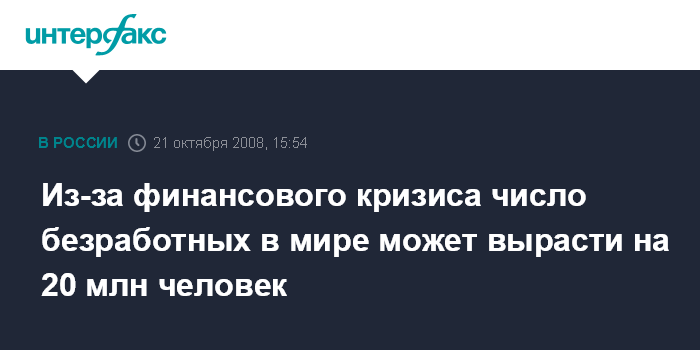 Нью-Йорк (ООН). 21 октября. INTERFAX.RU - Мировой финансовый кризис может привести к росту армии безработных на планете на 20 миллионов человек, прогнозирует международная организация труда (МОТ).