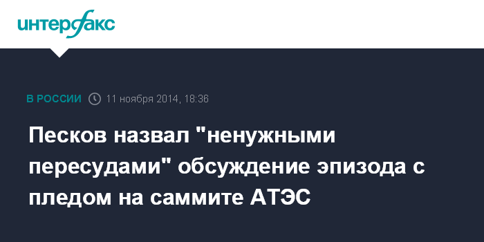 Москва. 11 ноября. INTERFAX.RU - Пресс-секретарь президента России Дмитрий Песков назвал "пересудами и ненужными дискуссиями" обсуждение в прессе и интернете поступка Владимира Путина, который подал плед супруге председателя КНР Си Цзиньпина на одном из мероприятий в рамках саммита АТЭС.