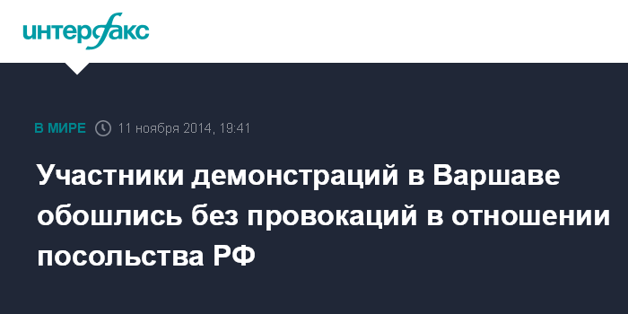 Москва. 11 ноября. INTERFAX.RU - Никаких провокаций в отношении здания российской дипмиссии в Варшаве в ходе происшедших во вторник столкновений полиции и участников националистического движения "Марша независимости" не было, сообщили в посольстве РФ в Варшаве.