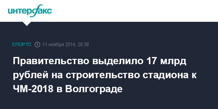 Москва. 11 ноября. INTERFAX.RU - Проектирование и строительство в Волгограде стадиона "Победа", где в 2018 году пройдут матчи чемпионата мира по футболу, обойдется в 17,3 млрд рублей.