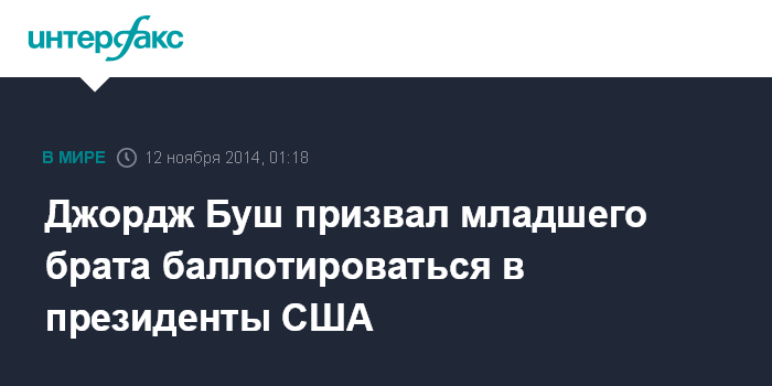 Москва. 12 ноября. INTERFAX.RU - Джордж Буш-младший призвал своего брата Джеба поучаствовать в президентской гонке 2016 года, сообщила во вторник газета The Telegraph.