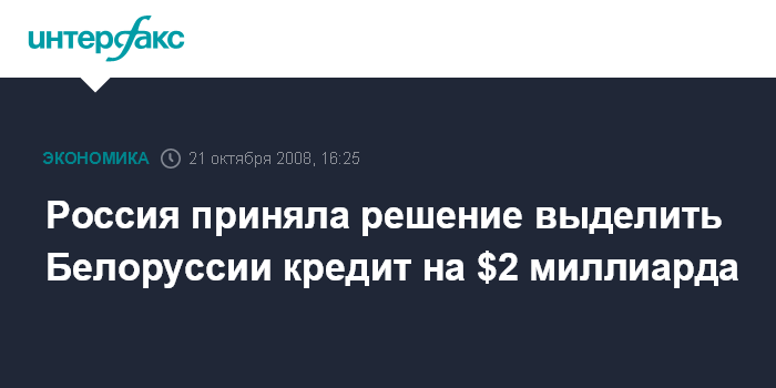 Москва. 21 октября. INTERFAX.RU - Россия приняла решение о выделении Белоруссии кредита на $2 млрд, сообщил министр финансов РФ Алексей Кудрин в беседе с журналистами.
