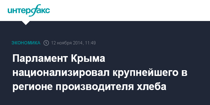Москва. 12 ноября. INTERFAX.RU - Государственный совет Республики Крым принял в среду решение о национализации ПАО "Крымхлеб", продукция которого занимает 36% рынка хлебобулочных изделий в регионе, и ПАО "Комбинат хлебопродуктов города Симферополя", которое является основным поставщиком муки для ПАО "Крымхлеб", передает корреспондент "Интерфакса".