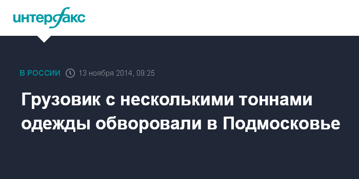 Москва. 13 ноября. INTERFAX.RU - Фуру с одеждой общей стоимостью 2,7 млн рублей обокрали на юге Подмосковья, сообщили "Интерфаксу" в пресс-центре МВД России.