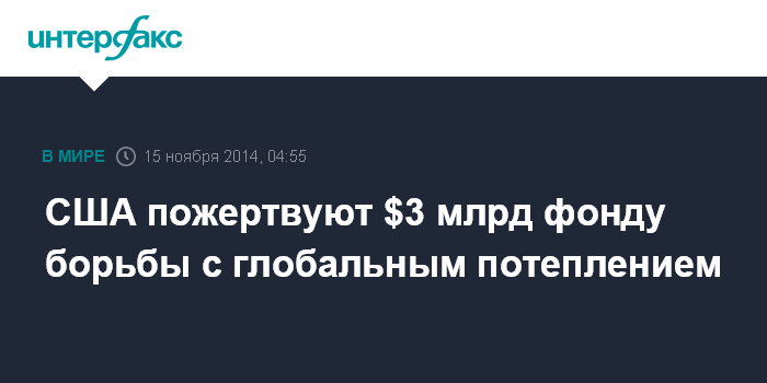 Москва. 15 ноября. INTERFAX.RU - Президент США Барак Обама заявил о готовности внести $3 миллиарда в фонд ООН, призванный помочь бедным странам бороться с пагубными последствиями глобального потепления, сообщило агентство Bloomberg.